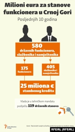 Prethodna vlast Demokratske partije socijalista (DPS) za poslednjih deset godina iz državnog budžeta utrošila je oko 25 miliona eura na riješavanje stambenih pitanja 175 javnih funkcionera i 405 nižih činovnika, saopštila je Vanja Ćalović Marković, čelnica Nacionalnog savjeta za borbu protiv korupcije na visokom nivou.
