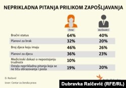 “Pitanje da li ima djecu, da li planira djecu i čitav set pitanja koje se postavljeju ženama od strane poslodavaca, a svjedoče o diskriminaciji. I ovo istraživanje je pokazalo da Crna Gora po povom pitanju ne ide naprijed nego se bukvalno vraćamo daleko u prošlost. Nadam se da će ovo biti signal svim subjektima u društvu da prepoznaju problemi diskriminacije žena i da se ova pojava u oblasti zapošljavanja svede na najmanju moguću mjeru” , kazala je za Radio Slobodna Evropa članica Izvršnog odbora Unije slobodnih sindikata Sandra Obradović