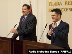 Premijer Republike Srpske Milorad Dodik i ministar spoljnih poslova Srbije, Vuk Jeremić, na pres konferenciji u Banjaluci, novembar 2010. Foto: Boris Miljević