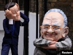Demonstrant sa maskom lica Ruperta Mardoka i britaski premijer Dejvid Kameron ispred cMardokovog stana u centru Londona, 13. jul 2011.