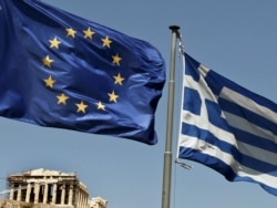 zastave Grčke i Eu iznad drevnog hrama Partenona na Akropolju, Atina, 11. jul 2011.