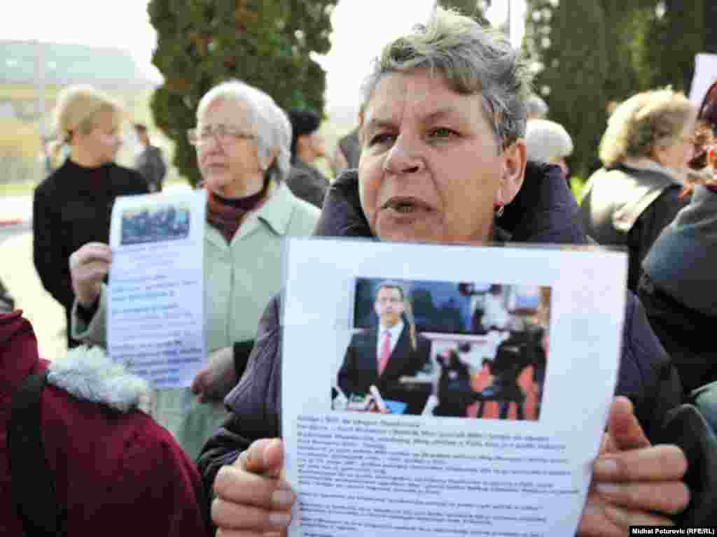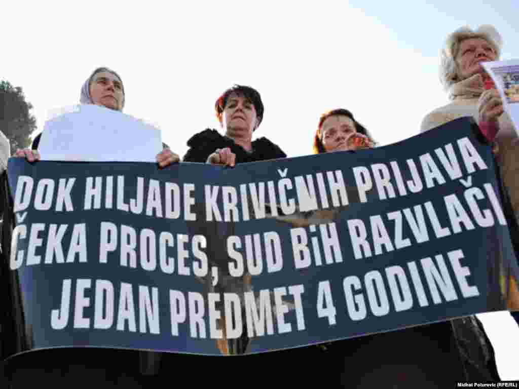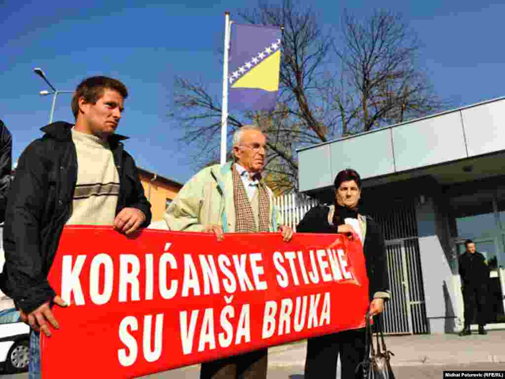 Predstavnici udruženja koja okupljaju porodice nestalih sastali su se pred Sudom BiH kako bi iskazali nezadovoljstvo odlukom Apelacionog vijeća da se Zoranu Babiću, Miloradu Škrbiću i Željku Stojniću, kojima se sudi za zločin počinjen na Korićanskim stijenama, ukine prvostepena presuda. 2. novembar 2011. (Autor: Zvjezdan Živković)