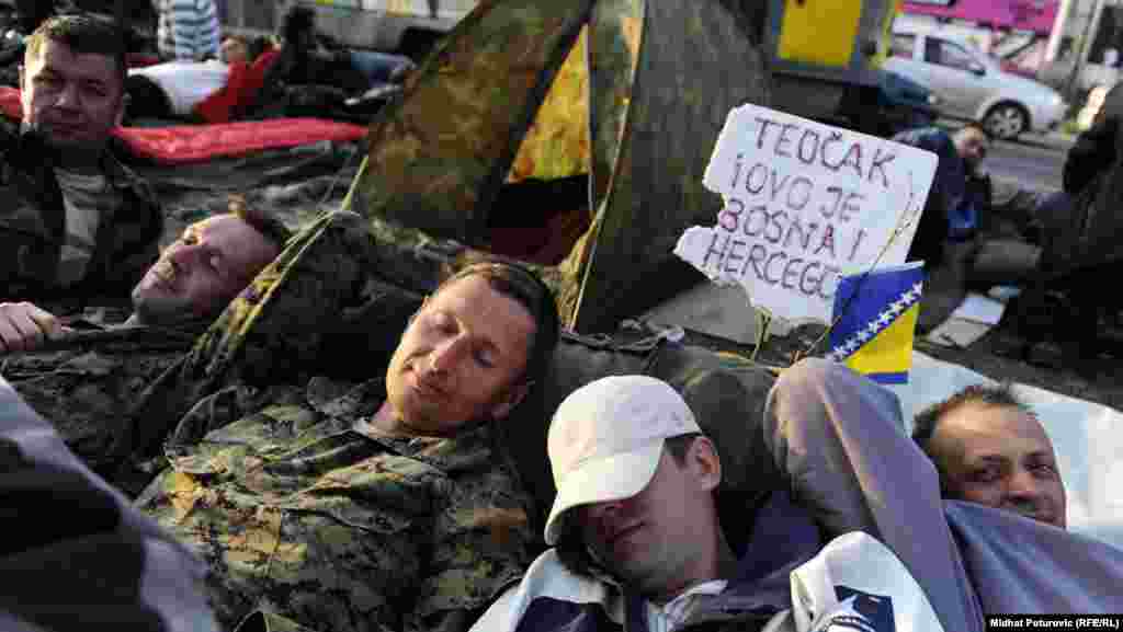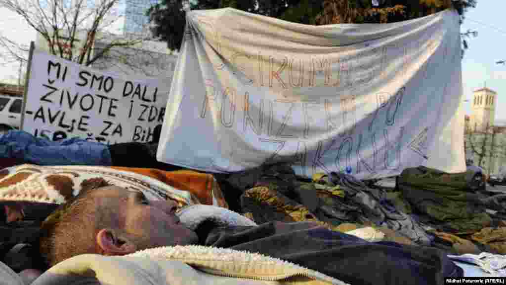 Bivši pripadnici Oružanih snaga BiH i drugu noć su proveli na otvorenom ispred zgrade institucija BiH i nastavljaju započeti štrajk glađu, Sarajevo, 23.03.2012. Foto: RSE / Midhat Poturović