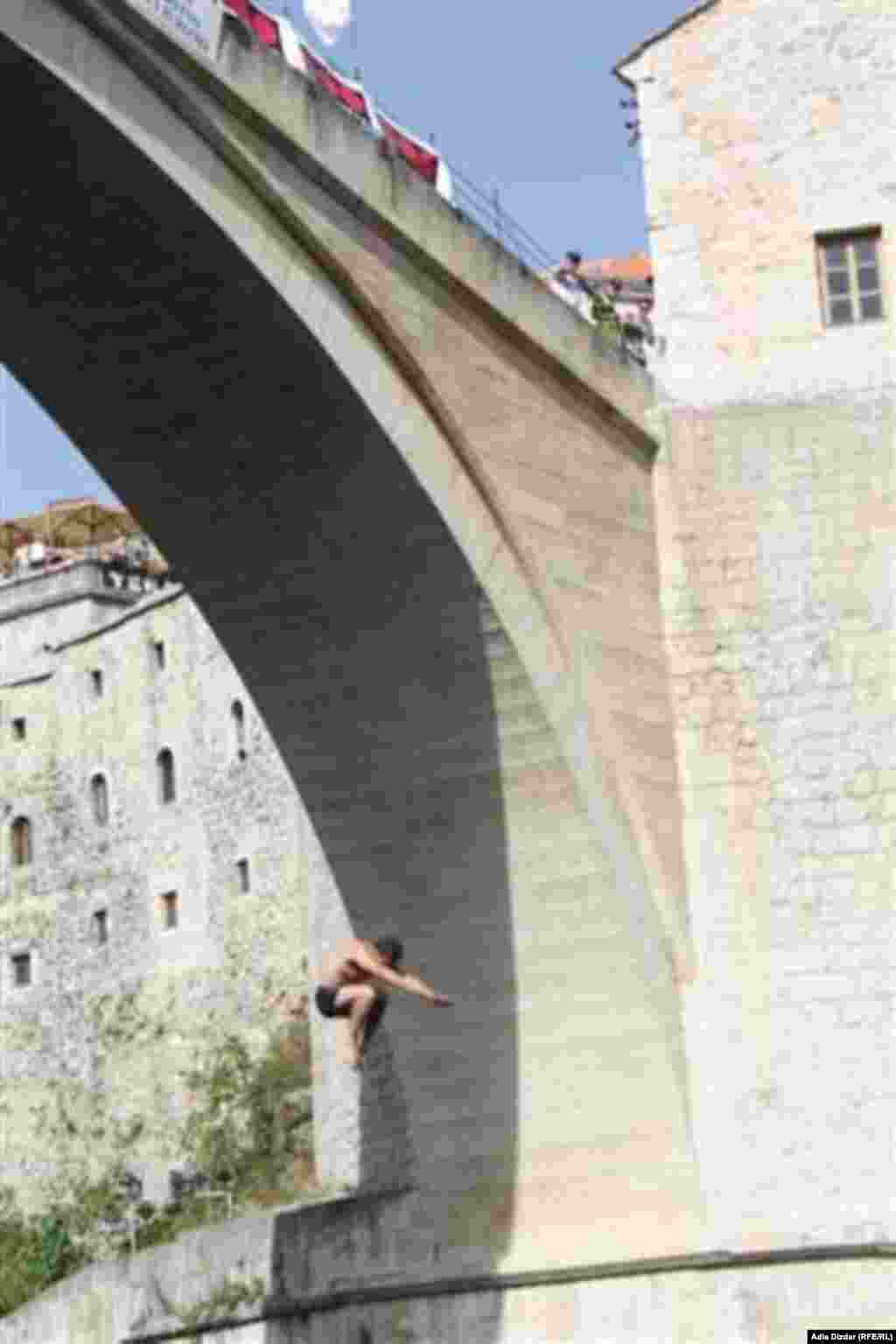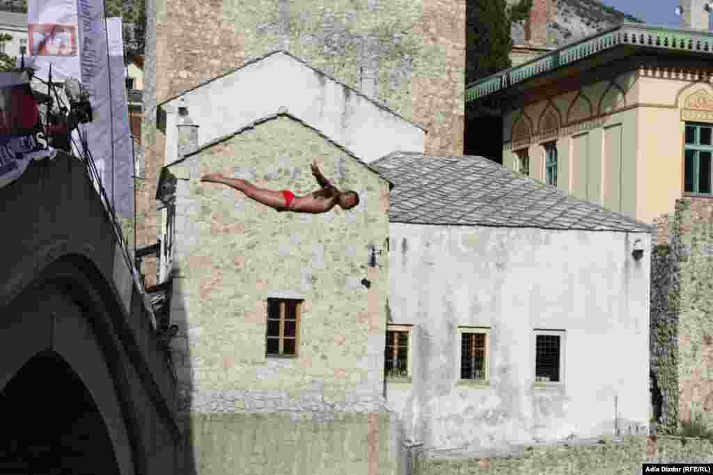 Mostarac Lorens Listo pobjednik je 446. skokova sa Starog mosta, čime je odbranio titulu najboljeg u kategoriji skokova na glavu. Drugi je bio takođe Mostarac Ilija Spasovski, a treći Aleksandar Simanić iz Užica. , 29.7.2012. RSE Foto/Adla Dizdar