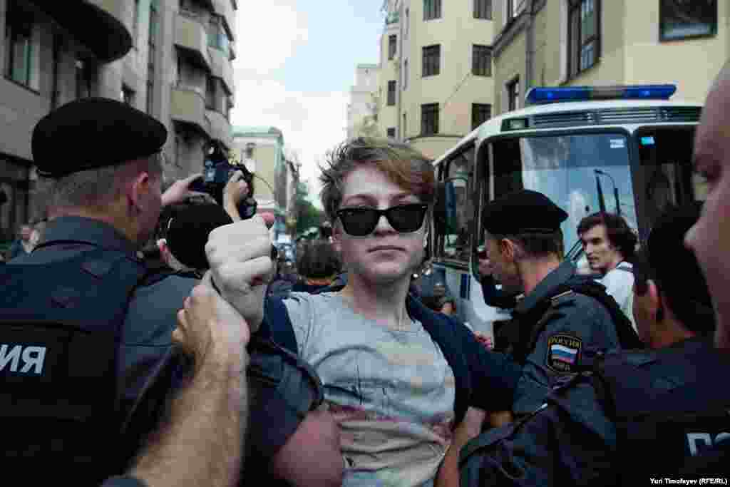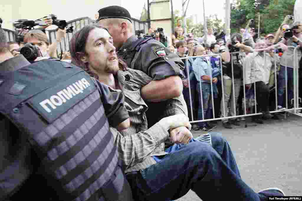 Sud u Moskvi proglasio je tri članice feminističke umjetničke pank grupe Pussy Riot "krivim za huliganstvo motivisano religijskom mržnjom", a zbog izvođenja njihovog performansa 'pank molitva' u poznatoj moskovskoj crkvi u februaru. Ispred sudnice, policija je zadržala nepoznat broj osoba koje su došle da podrže članice Pussy Riot i protestuju zbog presude. Moskva, 17.8.2012.
