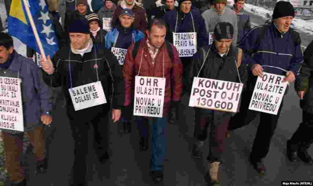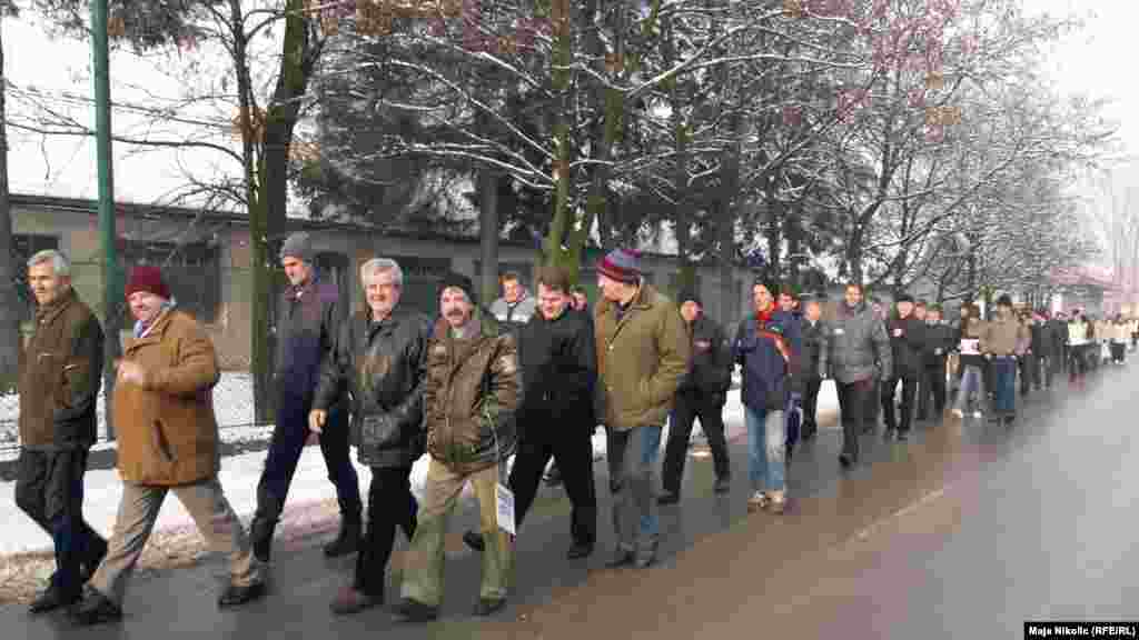 Oko 200 radnika tvornice namještaja Konjuh iz Živinica krenuli su u znak prosvjeda zbog narušenih radničkih prava pješice u Sarajevo pred zgradu OHR-a. Foto: Maja Nikolić, 28. januar 2013.