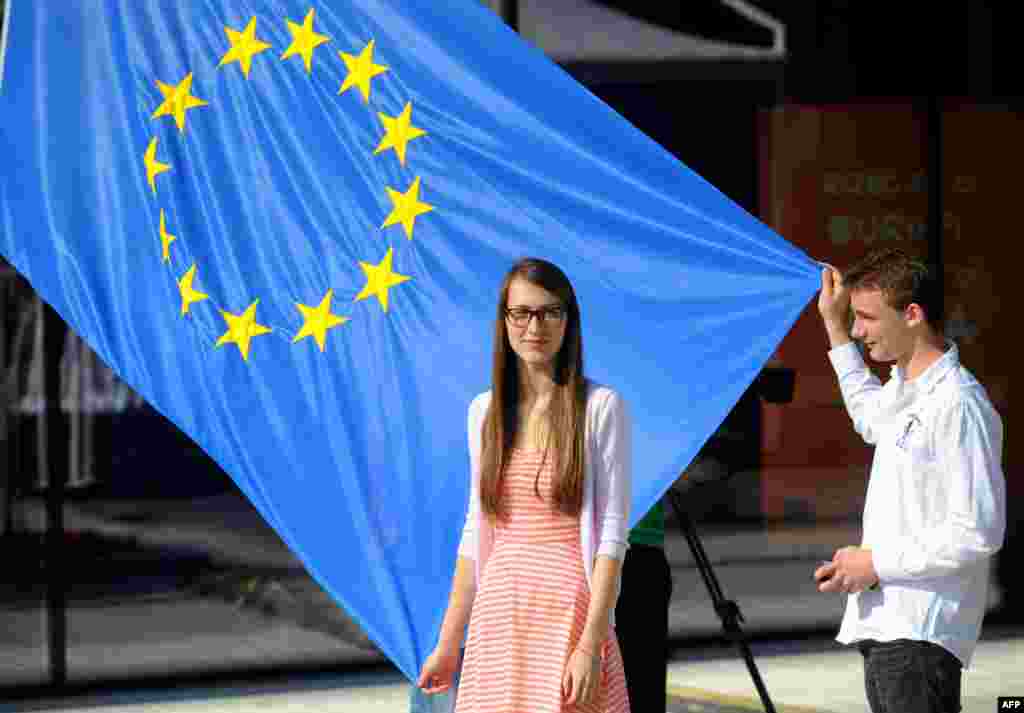 Zastava Hrvatske sa zastavama ostalih zemalja-članica EU ispred Evropskog parlamenta