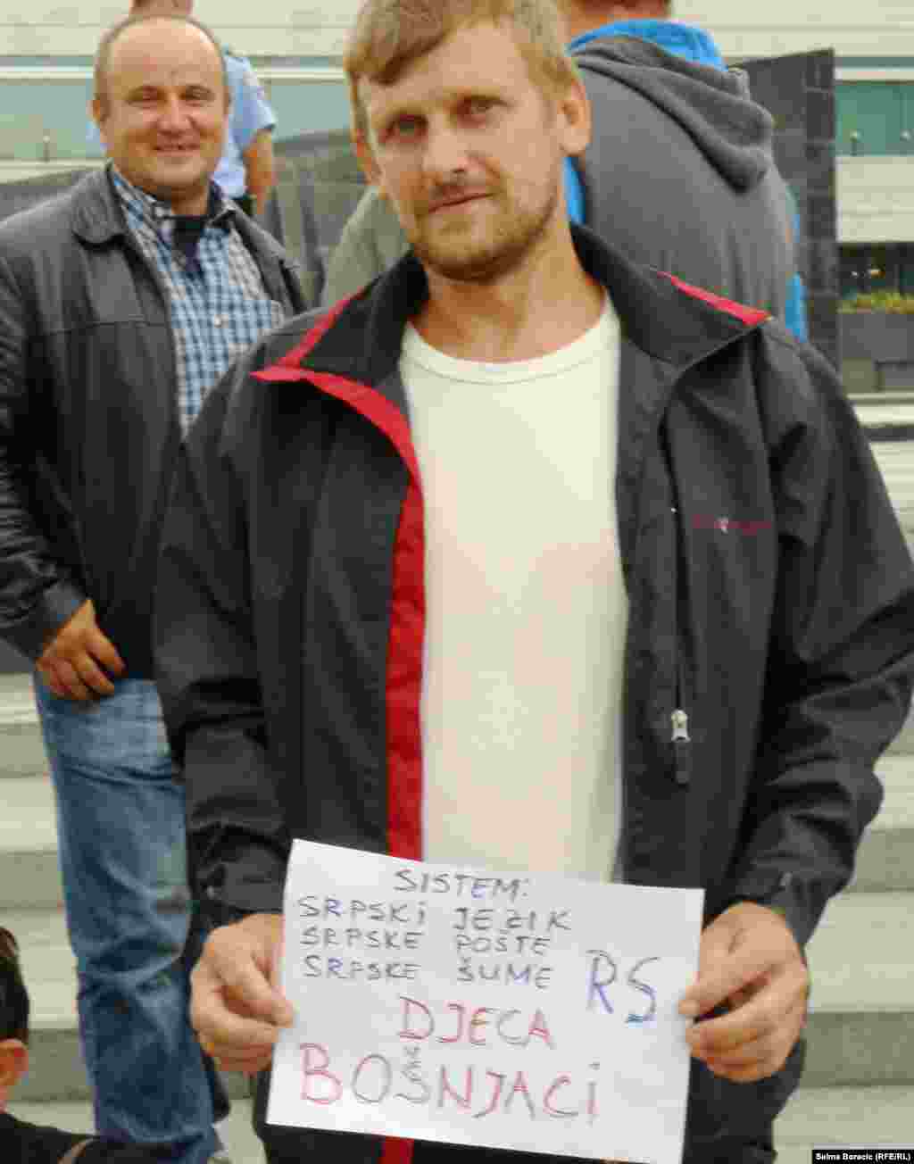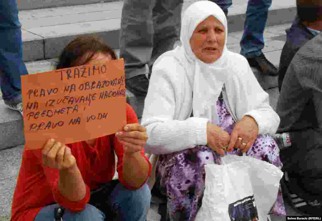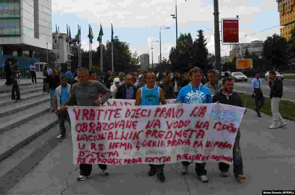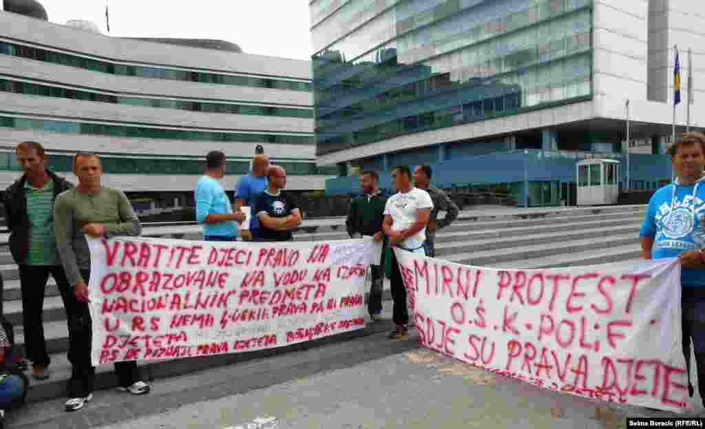 Četrdesetak roditelja djece bošnjačke nacionalnosti iz Konjević Polja okupilo se ispred Parlamenta BiH i Ureda visokog predstavnika u Sarajevu. Traže uvođenje nacionalne grupe predmeta i odvijanje nastave u osnovnim školama na službenim jezicima konstitutivnih naroda u BiH. 16. septembra 2013. Foto: Selma Boračić