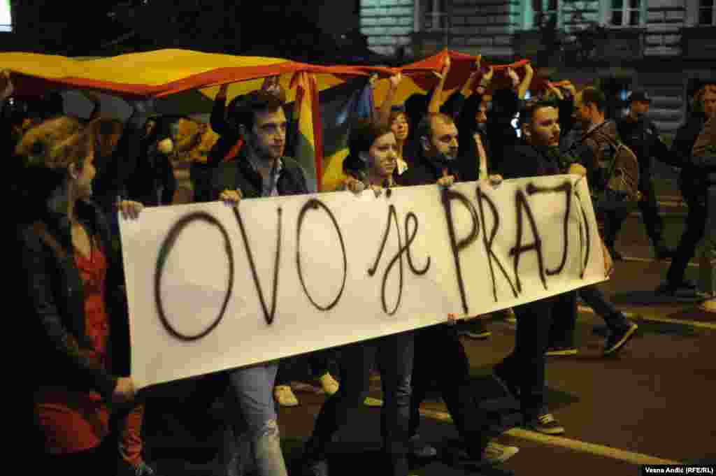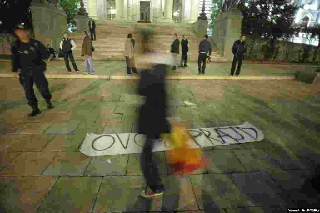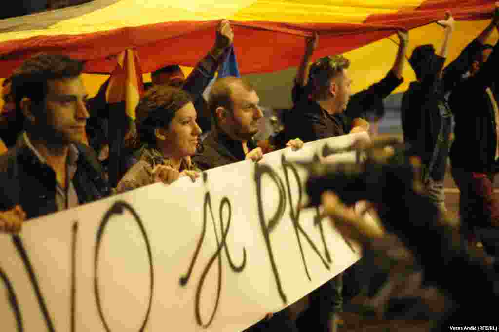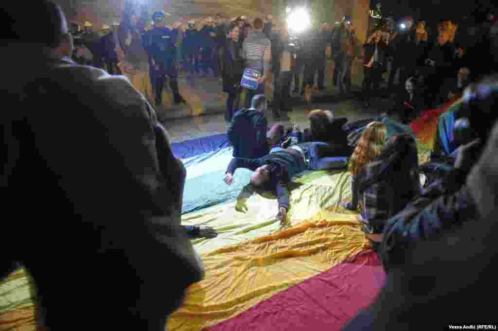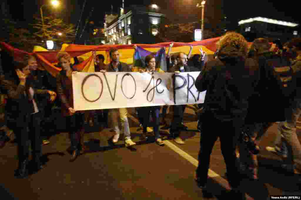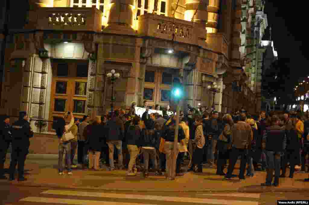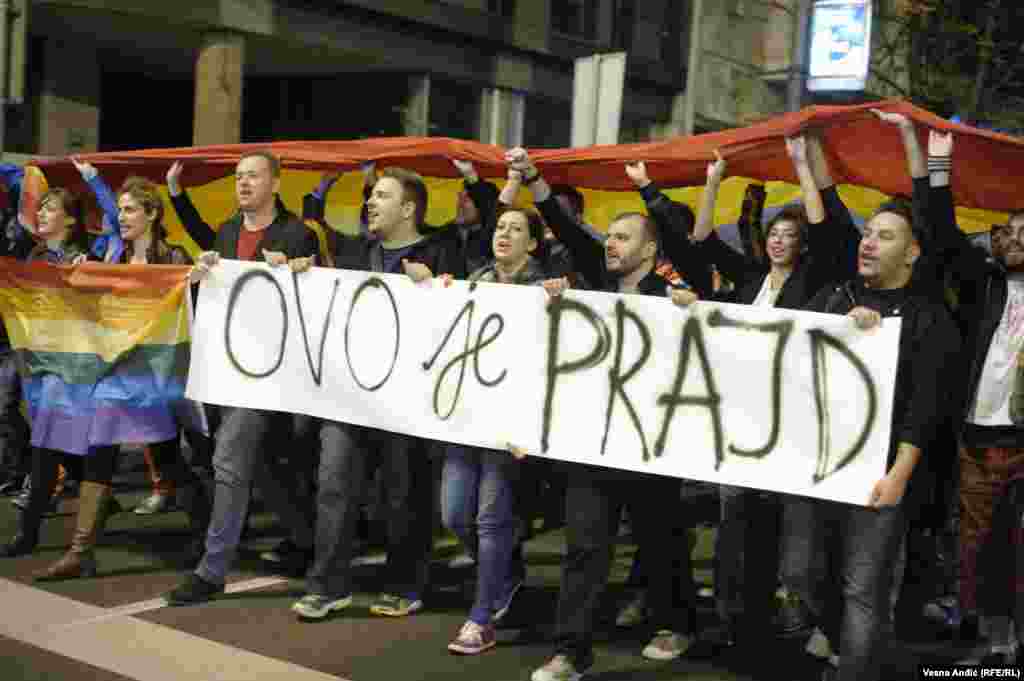 Nekoliko stotina mladih ljudi prošetalo je u petak uveče od zgrade Vlade do Skupštine Srbije u Beogradu u znak protesta zbog zabrane Parade ponosa. Uzvikivali su "Ovo je Srbija", "Živela ljubav", "Živeo prajd", a na kraju su zapevali "Aj Karmela". FOTO: Vesna Anđić