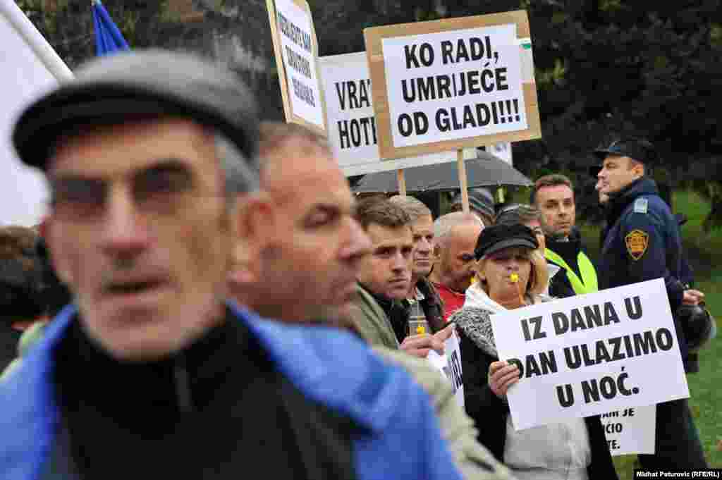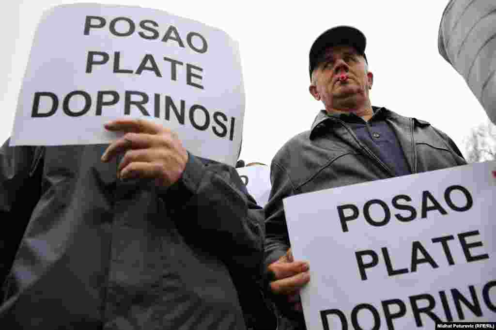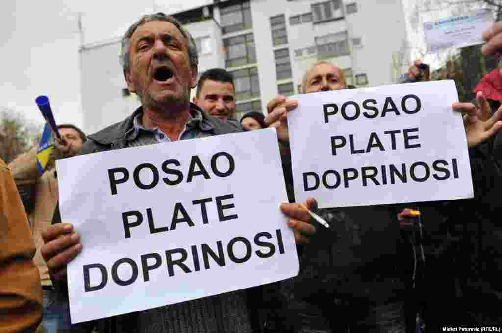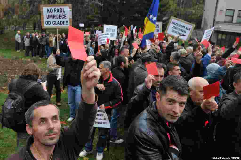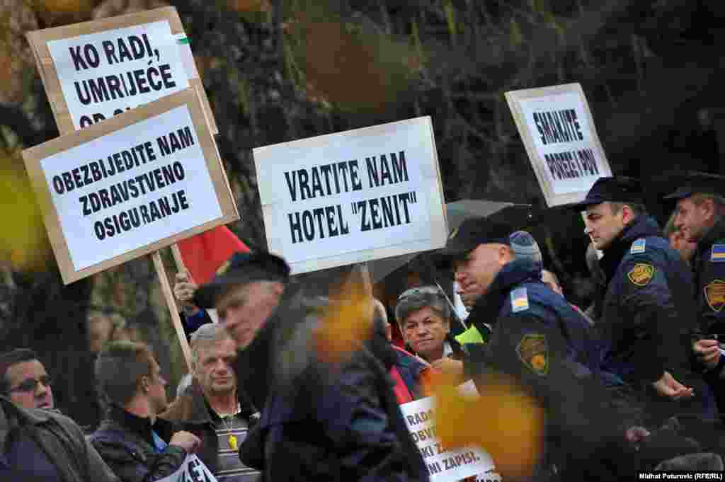 Nekoliko stotina radnika metalske industrije iz Zenice, Kaknja, Tuzle, Goražda i Sarajeva protestovalo je ispred Vlade Federacije BiH zbog gašenja firmi, gubitka hiljada radnih mjesta i nepoštivanja prava radnika. Sarajevo, 14.11.2013. RSE Foto/Midhat Poturović