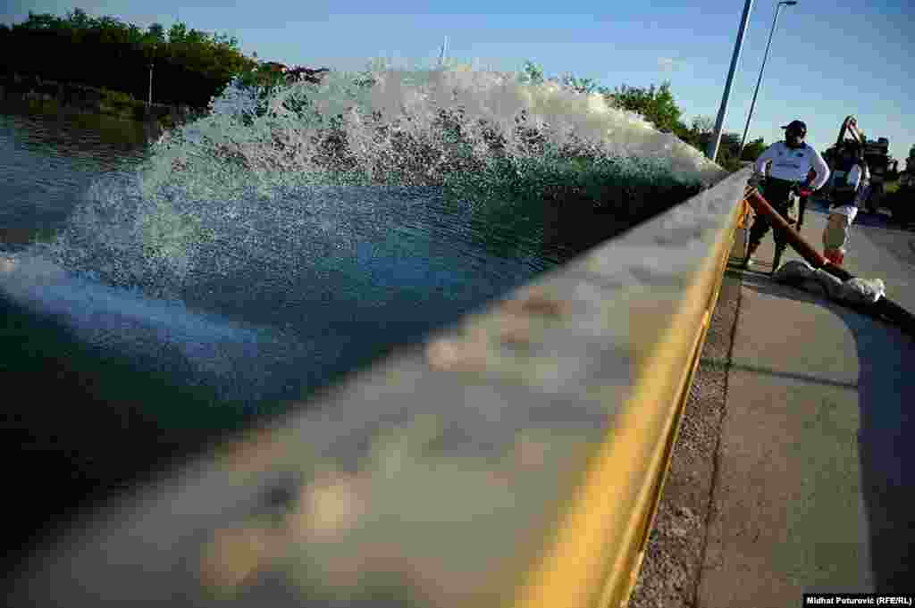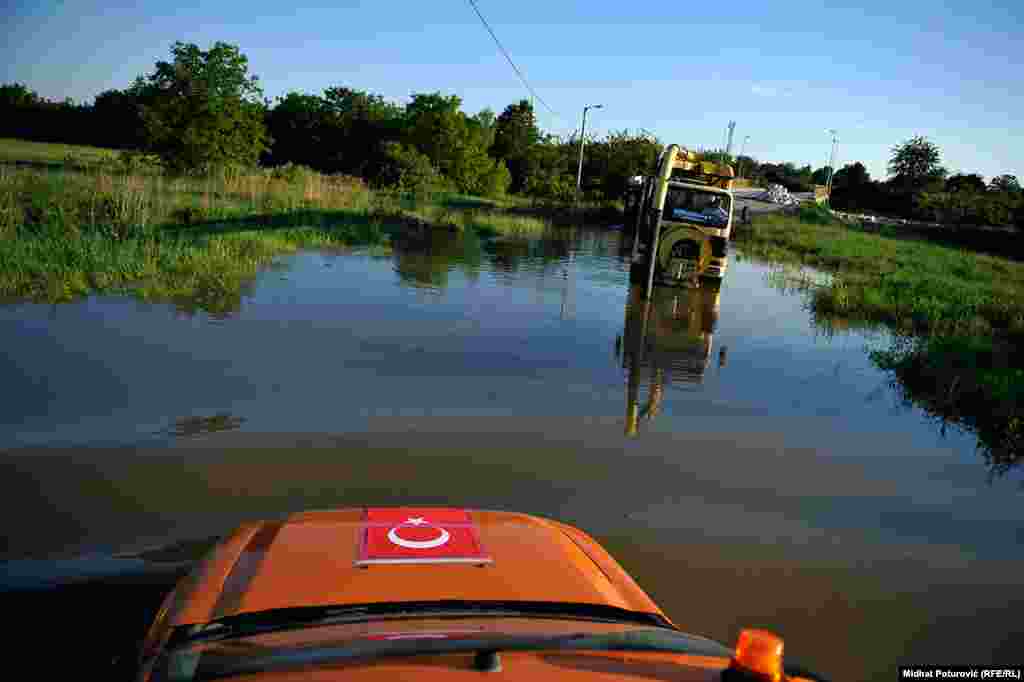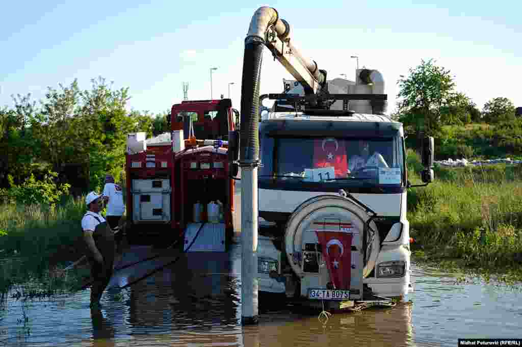 Prigradska naselja oko Brčkog, koja su poplavila prije šest dana, u srijedu su čistile i ispumpavale vodu iz poplavljenih dvorišta i cesta, spasilačke ekipe iz Turske. U Brčkom je tim od 50 ljudi sa 25 mašina, a mještani kažu kako su oni jedini koji su im, pored komšija, pritekli u pomoć. FOTO: Midhat Poturović