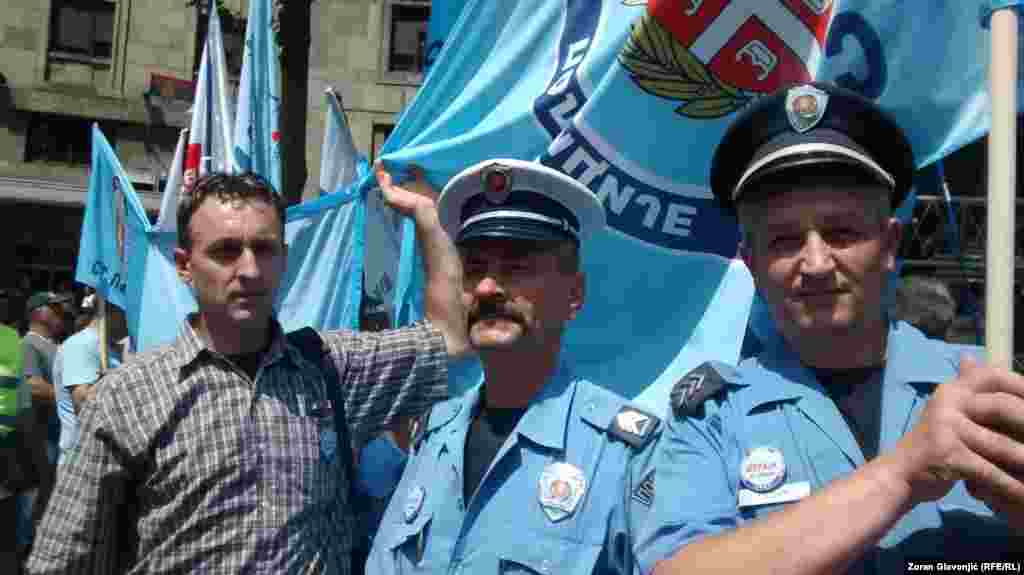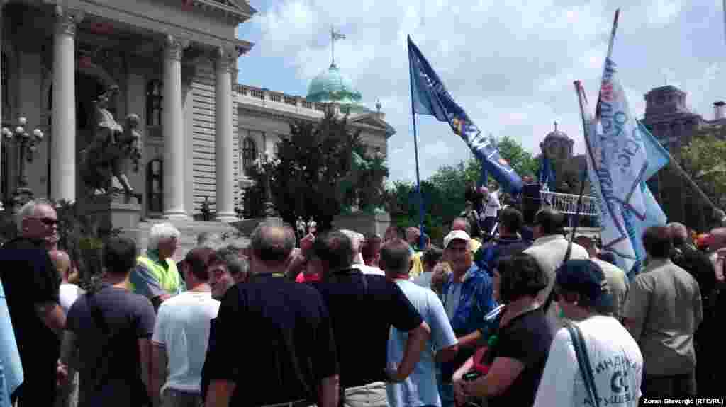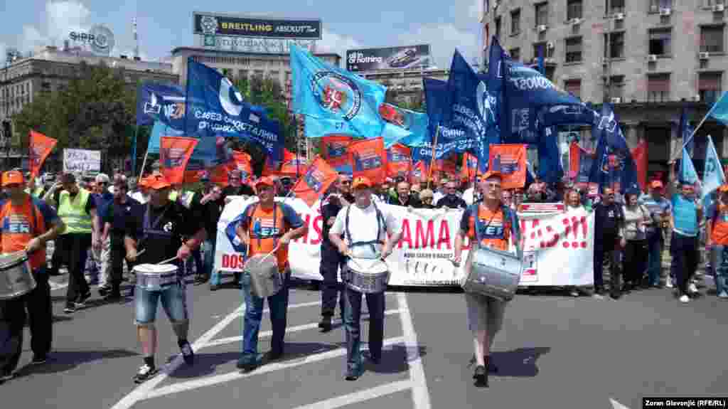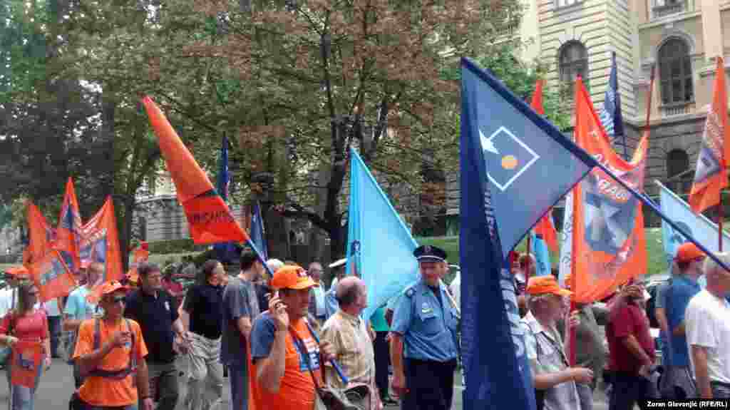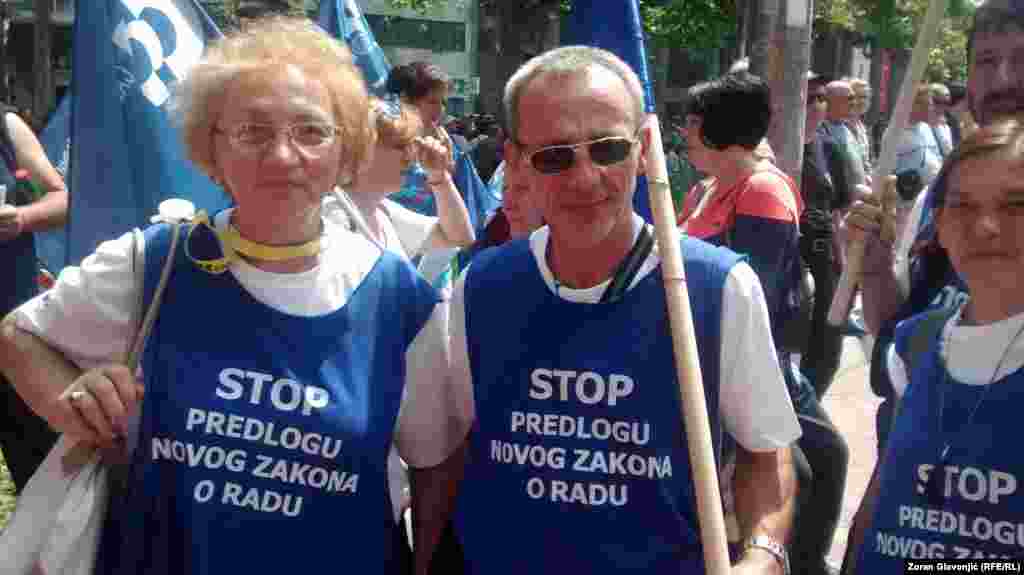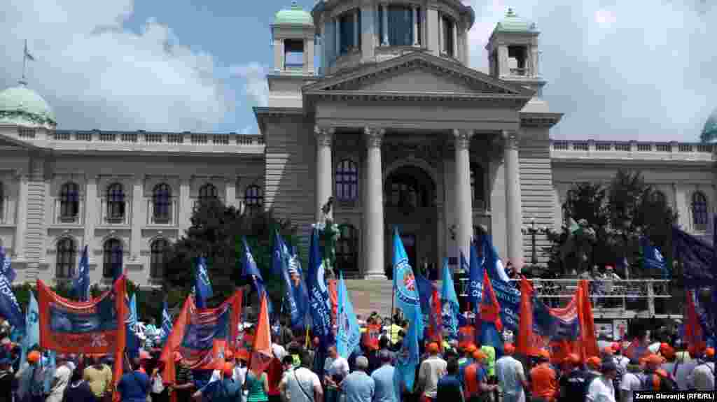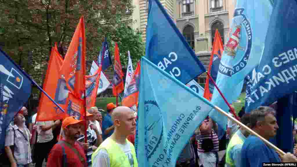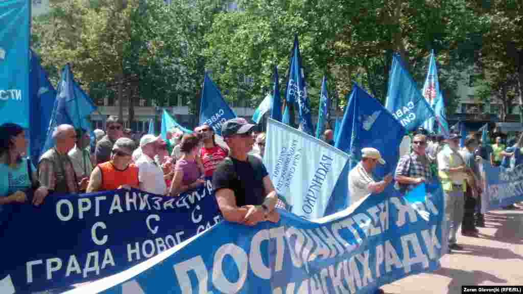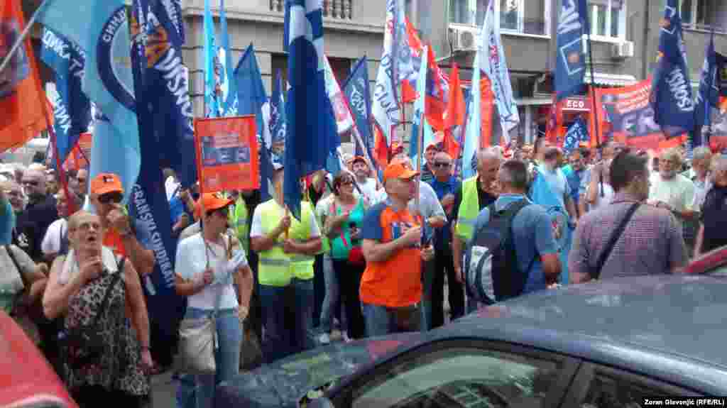 Nekoliko hiljada članova Saveza samostalnih sindikata Srbije i Ujedinjenih granskih sindikata Nezavisnost protestuju u Beogradu, nezadovoljni izmenama zakona o radu i o penzijskom i invalidskom osiguranju. FOTO: Zoran Glavonjić