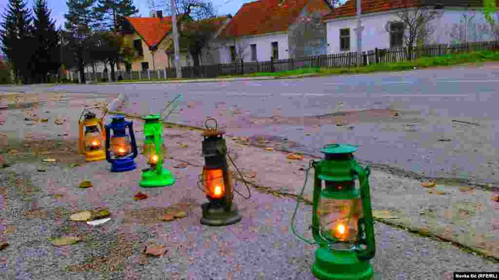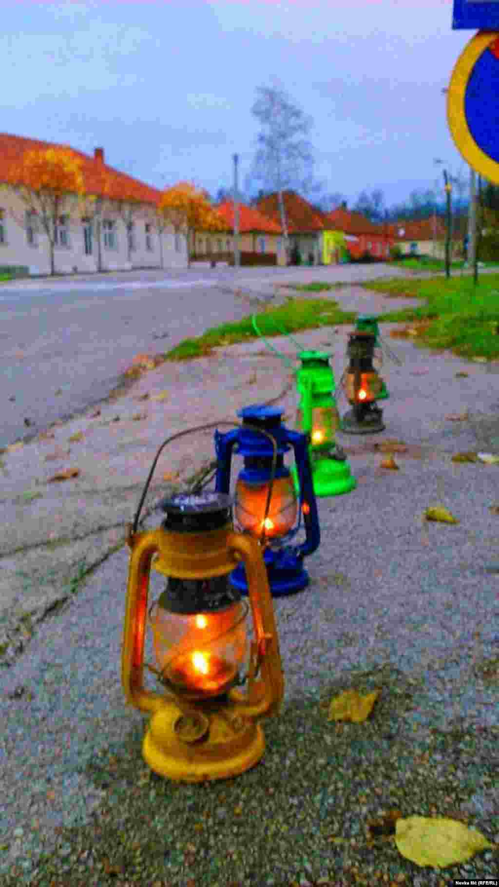 Meštani kosjerićkog sela Ražana sipaju petrolej u fenjere, da bi tokom večeri i noći glavna ulica naselja bila osvetljena. Fenjeri su ovde već duže ulična rasveta. Zbog neplaćenih računa za struju Ražana nema pola godine uličnu rasvetu. RSE / Foto: Novka Ilić