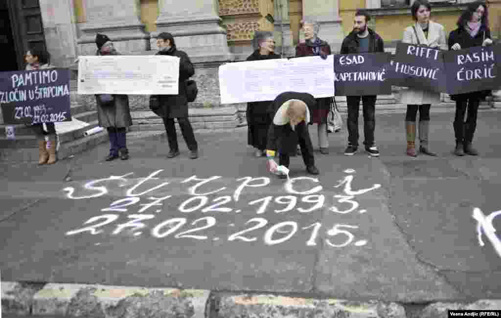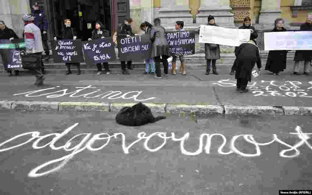Povodom dvadesetdvogodišnjice zločina u Štrpcima, Žene u crnom su održale mirovnu akciju Istina - odgovornost - pravda na platou ispred glavnog ulaza u Beogradsku železničku stanicu