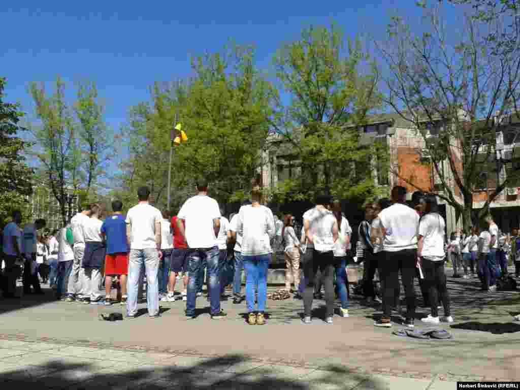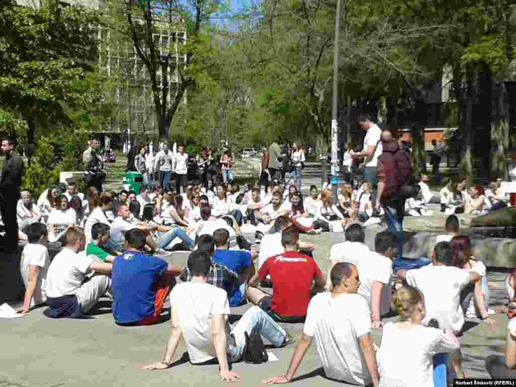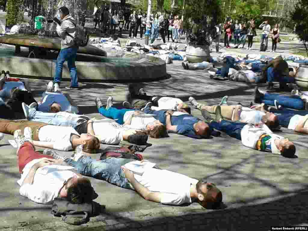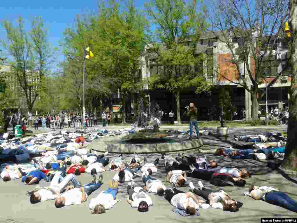 Tačno 147 sekundi – toliko je grupa studenata na novosadskom univerzitetskom kampusu ležala na podu. Sve u znak sećanja na njhove kolege iz Kenije koji su nastradali u terorističkom napadu početkom aprila RSE / Foto: Norbert Šinković