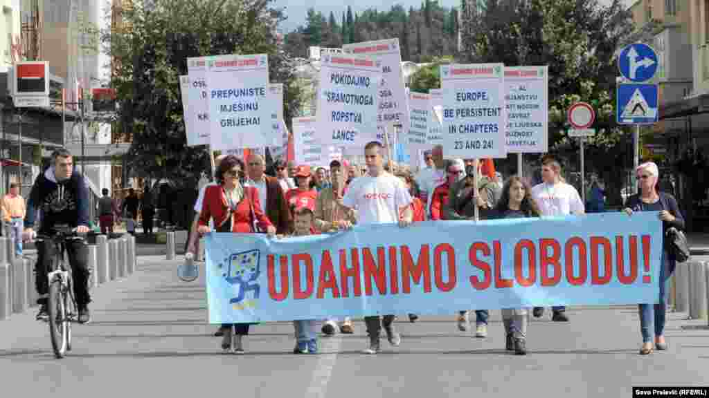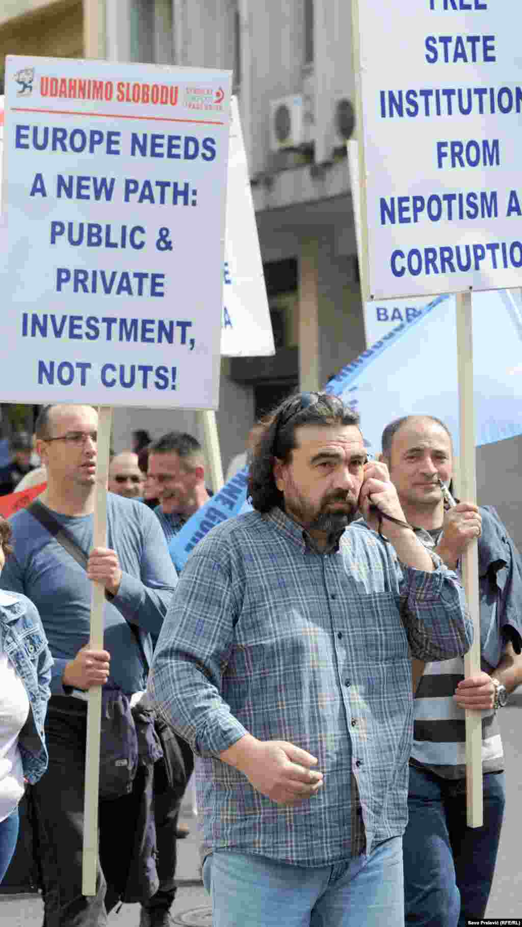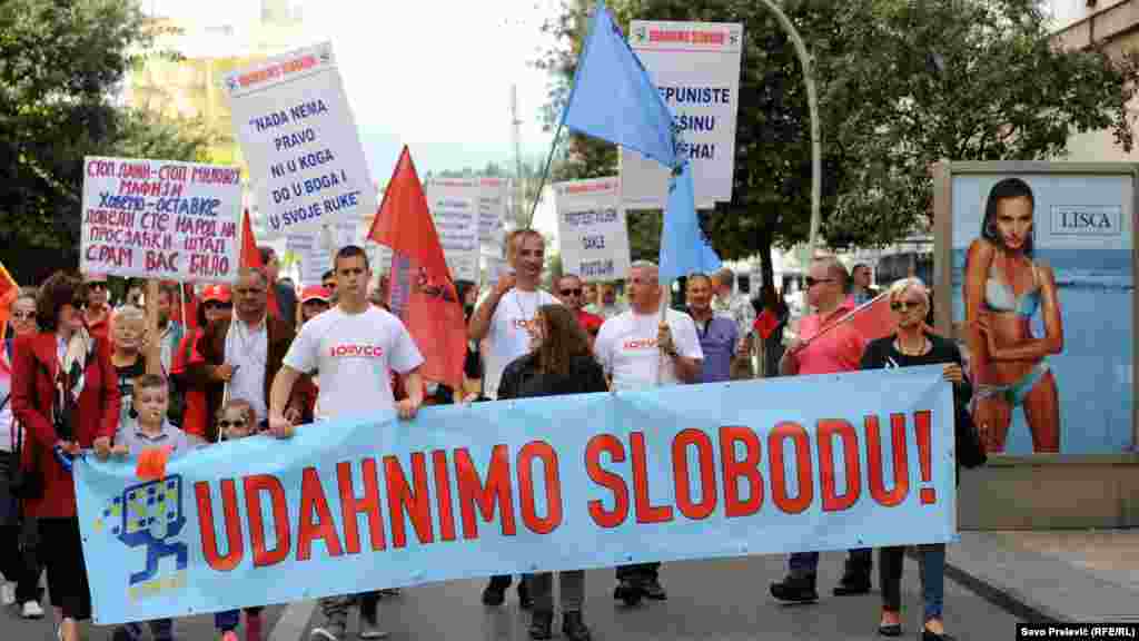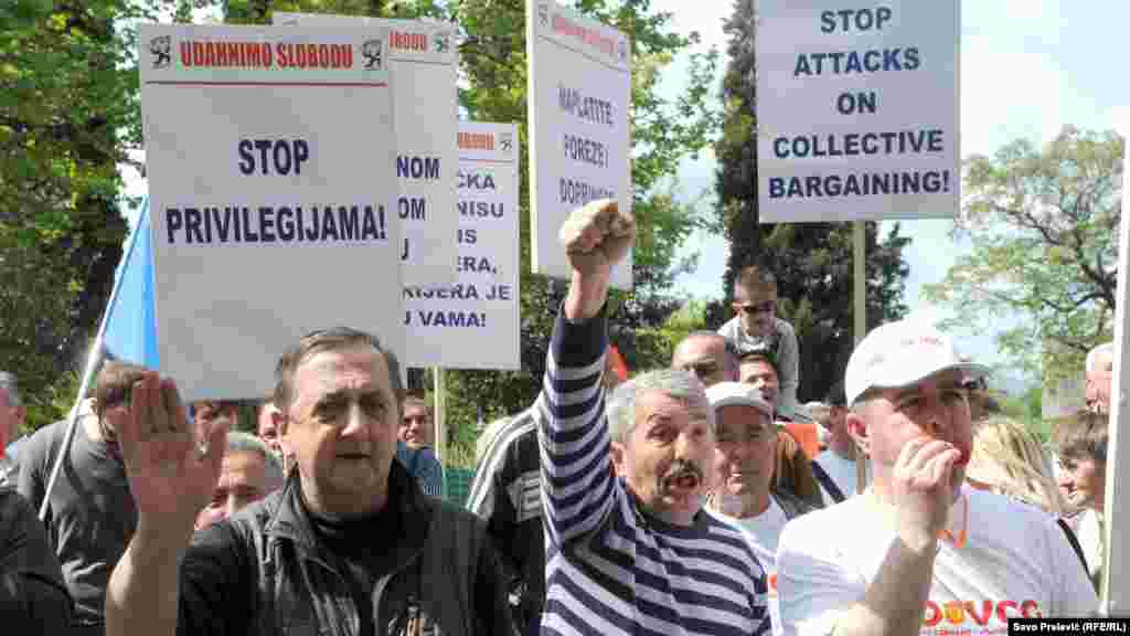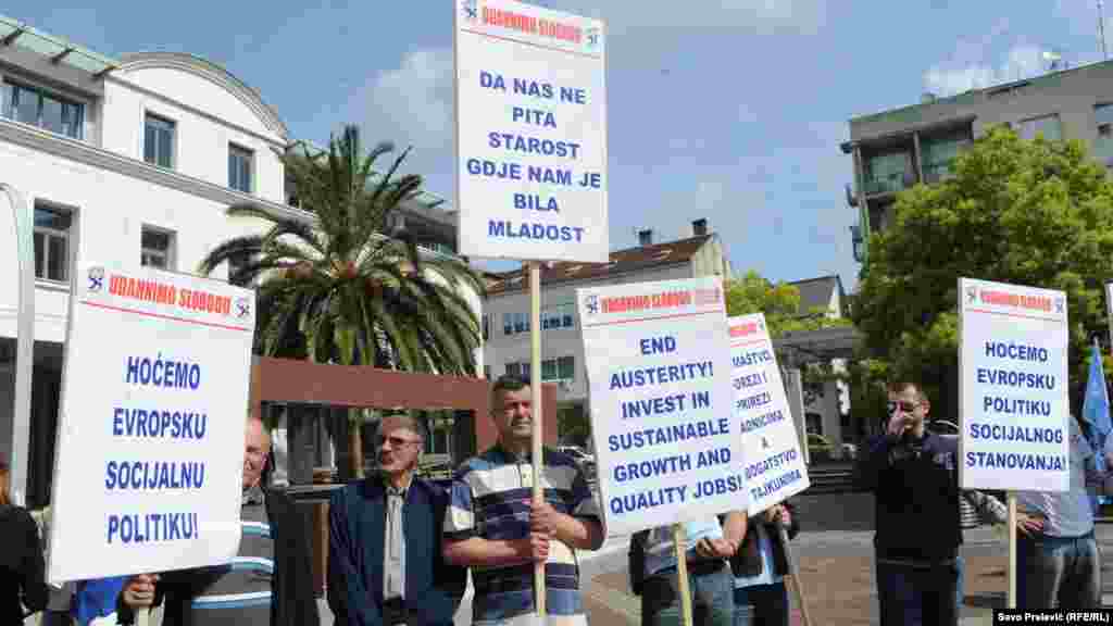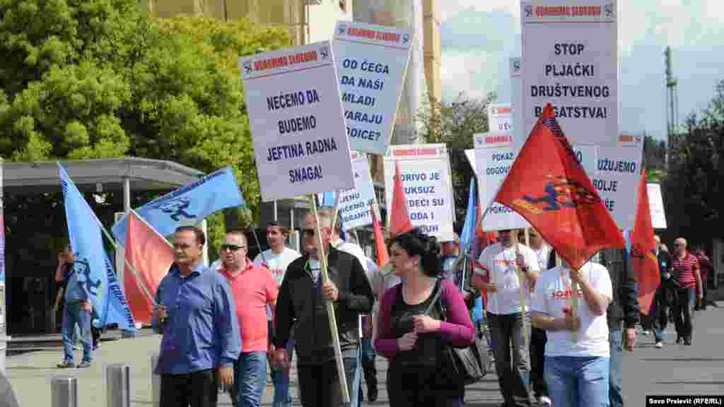Nekoliko stotina radnika izašlo je na ulice Podgorice kako bi podsjetili na loš položaj, povvodom Međunarodnog praznika rada. FOTO / RSE: Savo Prelević