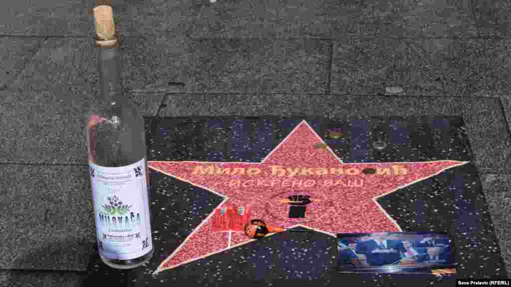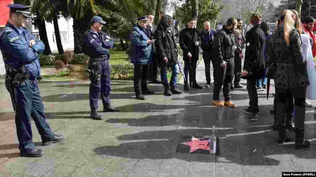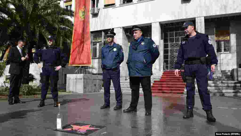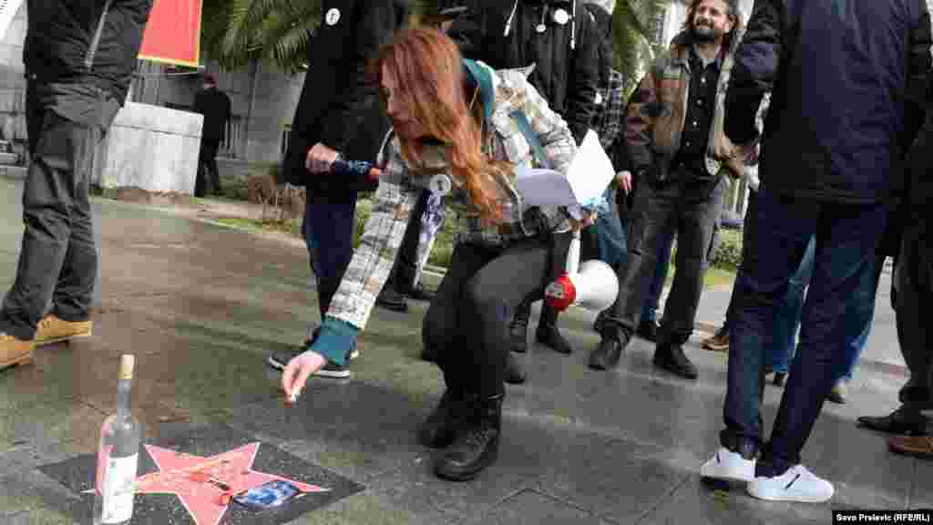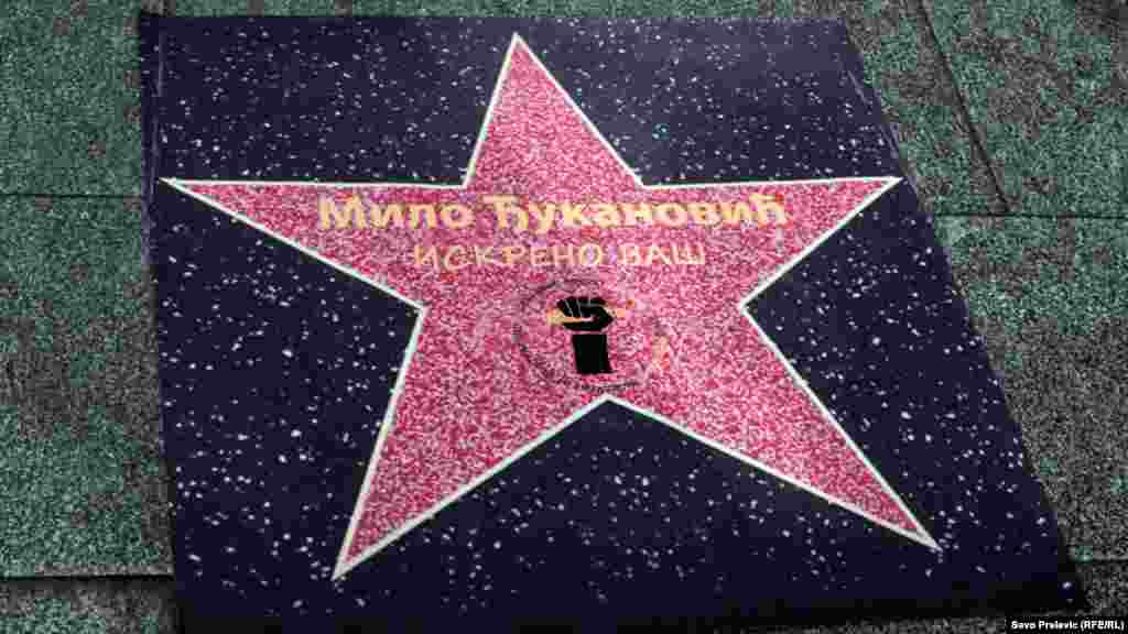 NVO Građanski pokret Otpor organizovala je performans ispred Skupštine Crne Gore povodom 54. rođendana premijera Mila Đukanovića. Organizacija poznata po anti vladinim i anti NATO stavovima, premijeru je dodijelila "zvijezdu slavnih" kao podsjećanje na, kako su ironično konstatovali, učinke njegove dvadesetogodišnje vladavine RSE foto / Savo Prelević