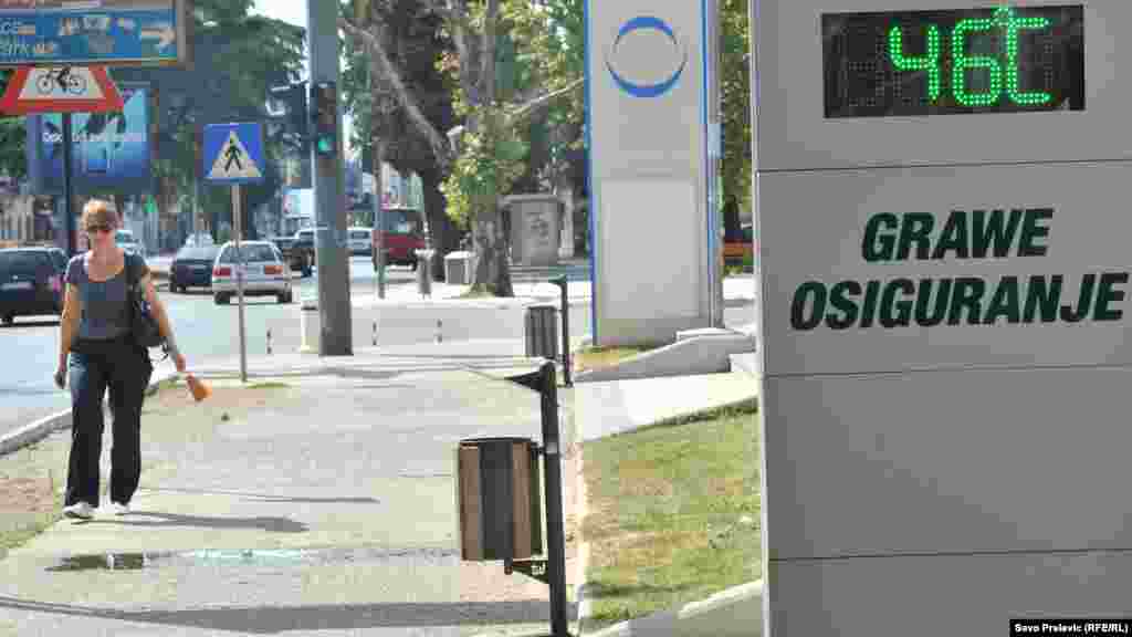 Zbog ekstremno visokih temperatura koje vladaju danima Hidrometeorološki zavod izdao je upozorenje, Crveni meteo alarm, za teritoriju cijele Crne Gore. Najavljeno je da će se se živa u termometrima za vikend popeti u Podgorici i Danilovgradu na 42 stepena Celzijusa. RSE/Foto: Savo Prelević