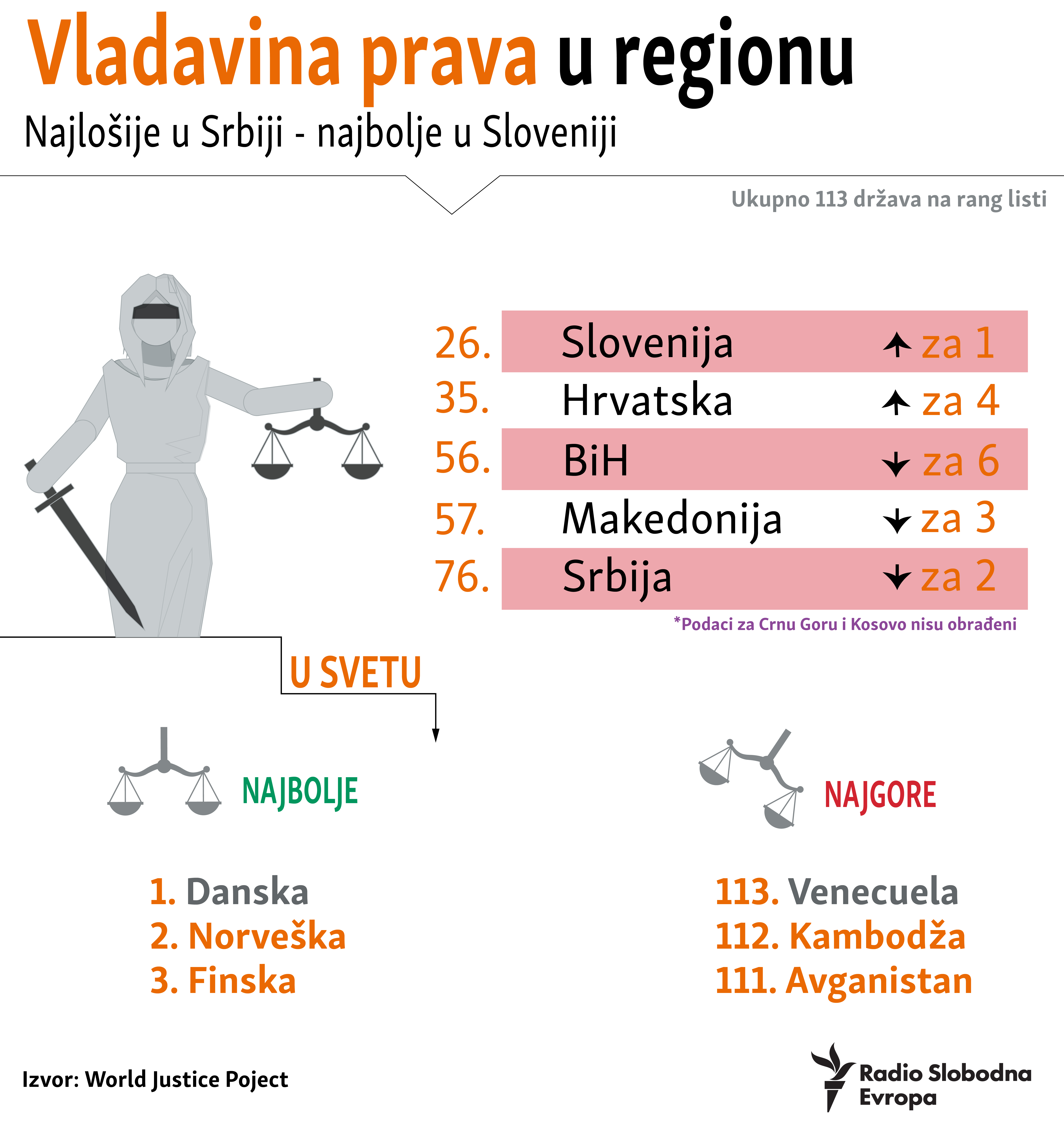 Prema najnovijem svetskom indexu u oceni vladavine prava, Srbija je najlošije pozicionirana u odnosu na ostale države regiona. Titula pravno najuređenije države i ove godine pripala je Danskoj.