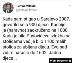 "Kada sam stigao u Sarajevo 2007. govorilo se o 900 djece. Kada je bila Pašovićeva izložba sa stolicama već je bilo 1.100 malih stolica za ubijenu djecu. Evo sad vidim naraslo na 1602. Jadna djeca...", napisao je Milović.