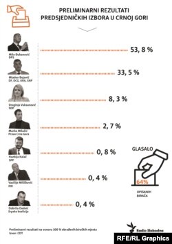 Predsjednički kandidat Mladen Bojanić koga je podržao veći dio opozicije osvojio je 33,6 odsto. Kandidatkinja Socijaldemokratske partije Draginja Vuksanović je osvojila 8,1 odsto glasova.