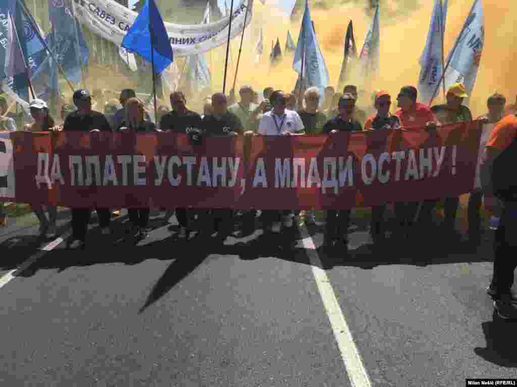 'Da plate ustanu, a mladi ostanu', slogan je pod kojim se na trgu Nikole Pašića, u centru Beograda, održava protest povodom Međunarodnog praznika rada – Prvog maja na kome se okupilo oko hiljadu ljudi.