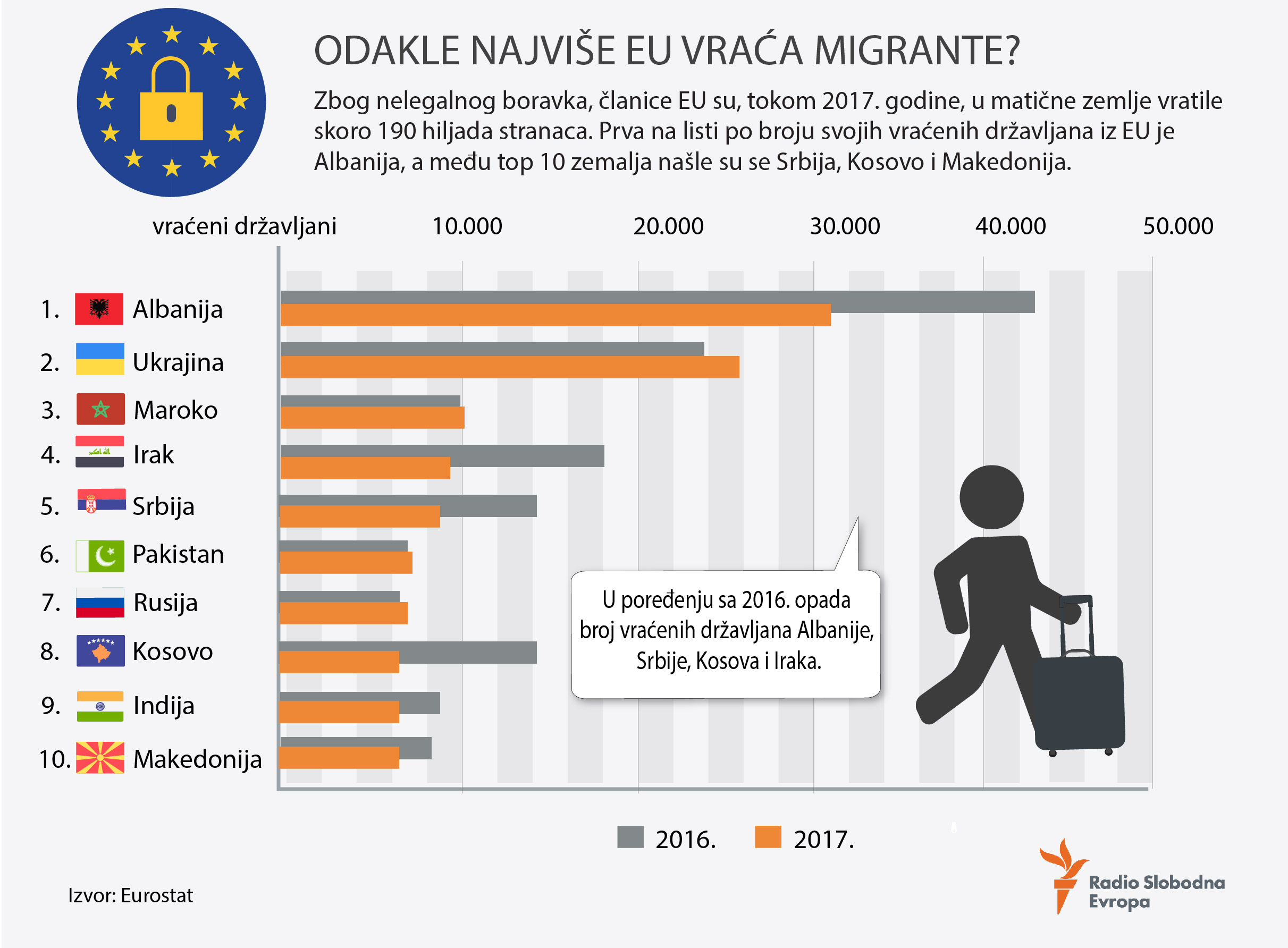Srbija je među pet zemalja čije državljane su članice EU najviše vrćaju u matičnu zemlju zbog ilegalnog boravka, pokazuju podaci Eurostata. Albanija je na vrhu te liste, a od zemalja regiona među prvih deset zemalja čiji državljani su vraćeni u zemlju porijekla su Kosovo i Makedonija. Tokom 2017. godine EU je identifikovala oko 620.000 stranih državljana koji su nelegalno boravili na njenoj teritoriji.