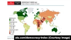 U izveštaju "Indeks demokratije 2018 - I ja takođe?", koji je obuhvatio 165 država i dve teritorije, ocenjeno je po 60 pokazatelja u pet širokih kategorija, koje obuhvataju izborni proces i pluralizam, funckionisanje vlade, političko učešće, demokratsku političku kulturu i građanske slobode. Dvadeset zemalja svrstano je u grupu puna demokratija, 55 su manjkave demokratije, 39 je u grupi hibridnih režima a 53 su autoritarni režimi.