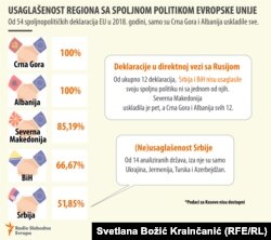 Potpunu usklađenost od 100 odsto imaju države zemalja u okruženju – Crna Gora i Albanija, Makedonija je u vrhu liste sa nešto više od 85 procenata, dok je BiH 66,7 odsto usklađena sa politikom EU.