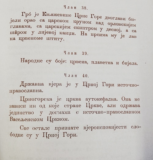Ustav Knjaževine Crne Gore u članu 40. normira položaj pravoslavne crkve u Crnoj Gori: “Državna