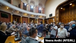 Poslanike, novinare, snimatelje i druge zaposlene su na ulazu u Skupštinu sačekali medicinski radnici koji su merili temperaturu svima, a na nekoliko pultova svi su morali da dezinfikuju ruke alkoholom, prenosi Beta.