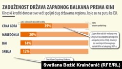 Takođe, Kina je na Zapadnom Balkanu prisutna i preko zajmova koje od nje uzimaju zemlje regiona. Prema podacima Minhenškog bezbednosnog izveštaja, udeo odobrenih kineskih kredita u Srbiji iznosi 12 posto od ukupnog spoljnog duga zemlje.