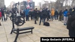 Na platou ispred Skupštine Srbije okupilo se oko stotinu ljudi, a učesnici su doneli sprave za vežbanje. Učesnici smatraju da fitnes klubovi i teretane nisu mesta zaraze i da se u tim objektima poštuju mere.