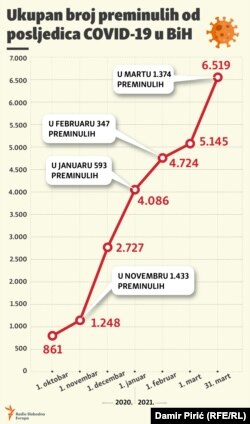 Prvi put od početka pandemije, u martu 2020. godine, broj oboljelih u Bosni i Hercegovini 2. aprila premašio je više od 2.000. Ipak, u dijelovima zemlje u kojim su na snazi stroge mjere, poput zabrana kretanja u večernjim satima, zatvaranja ugostiteljskih objekata i kladionica, broj novozaraženih je u blagom padu, a broj hospitalizovanih se smanjuje.