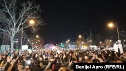 Okupljeni skandiraju "Gotov je", što je slogan koji je obeležio Petooktobarsku revoluciju 2000. godine, kada je srušen autokratski režim Slobodana Miloševića.