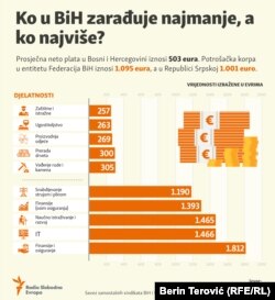 Po podacima Saveza samostalnih sindikata FBiH, prosječna plata u ovom entitetu u decembru 2021. godine iznosila je 999 maraka (511 evra), dok je u RS-u, kako pokazuju podaci Saveza sindikata RS-a, u istom mjesecu iznosila 1.038 maraka (531 evro).