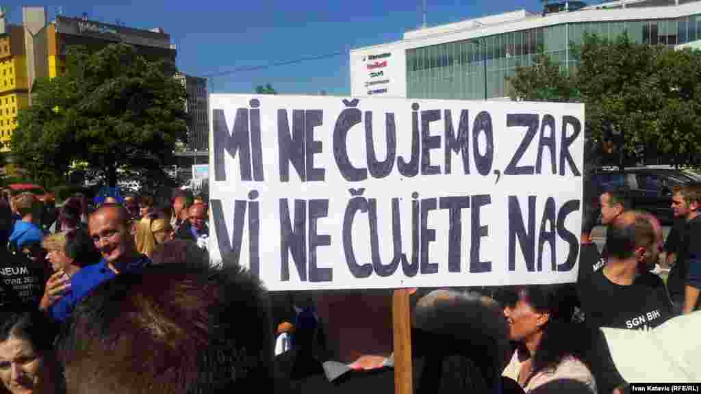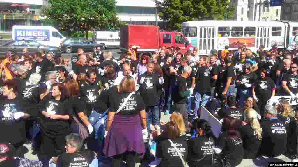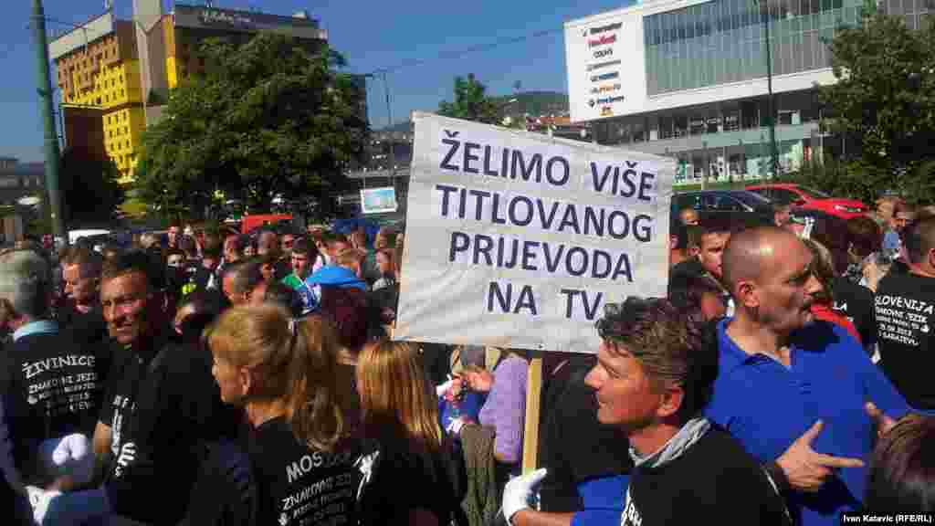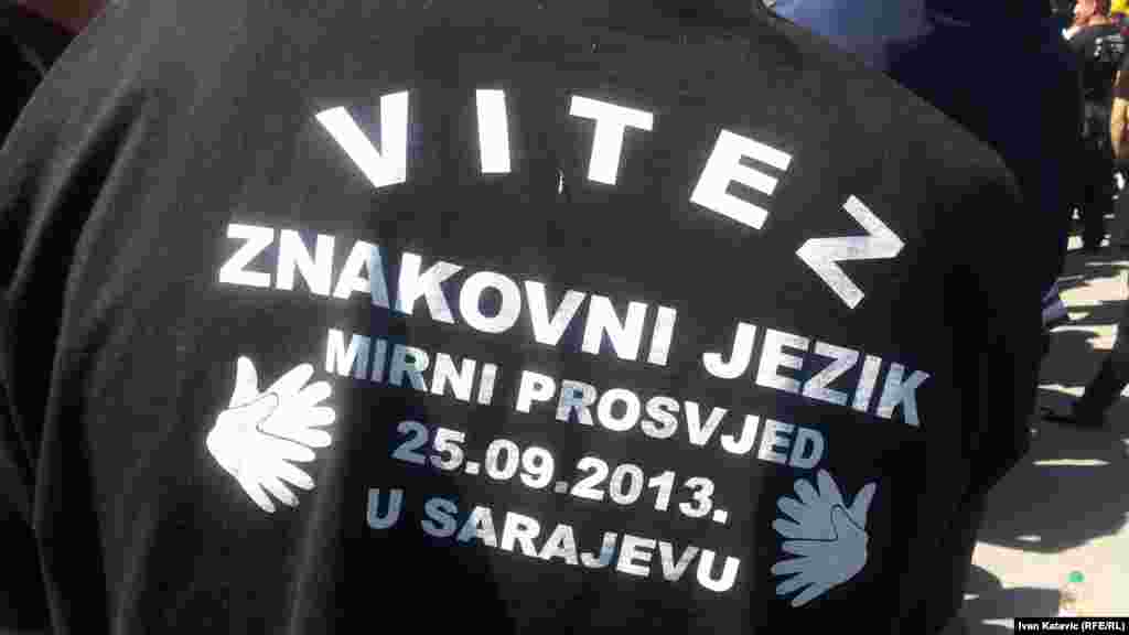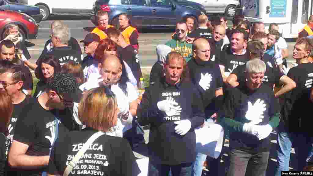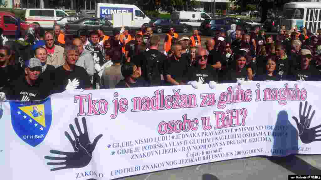 Povodom Međunarodnog dana gluhih i znakovnog jezika, u Sarajevu je organizirana mirna šetnja više od tisuću gluhih i nagluhih osoba iz cijele BiH. Na Trgu BiH vlastima su uputili zahtjeve koji se odnose na poboljšanje njihovog položaja u društvu. Foto: RSE / Ivan Katavić, 25. septembar 2013.