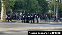 Redari koji obezbeđuju taj skup iza ograde povremeno upućuju uvrede demonstrantima koji prolaze ka Slaviji na protest studenata u blokadi.
