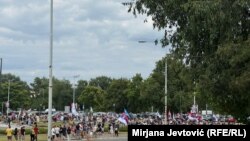 Okupljeni nose veliki broj nacionalnih zastava, kao i transparente.