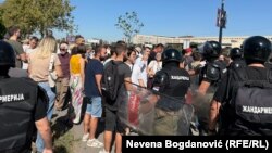 Studente i građane potiskuju policija i Žandarmerija i drže ih "u obruču" u blizini Palate "Srbija", javlja reporterka RSE.