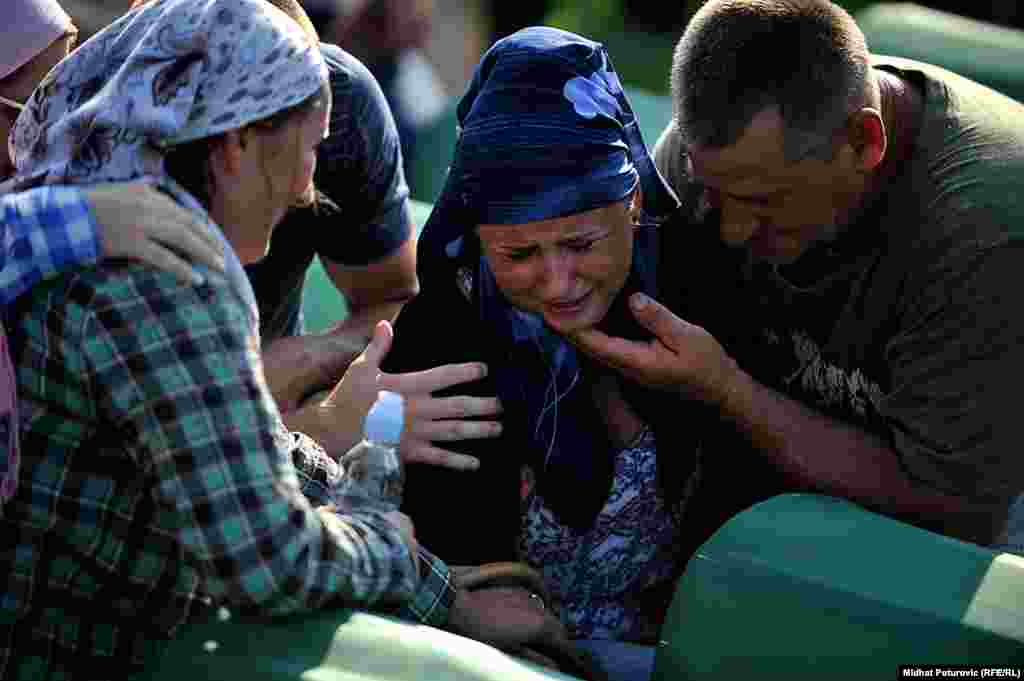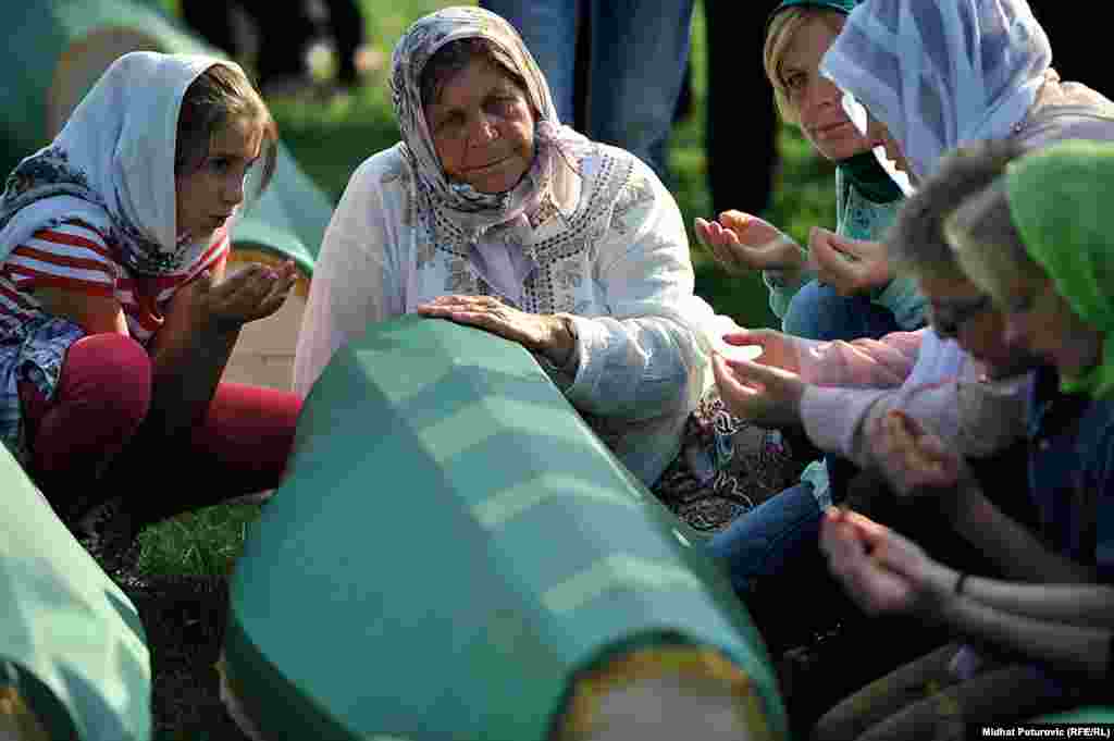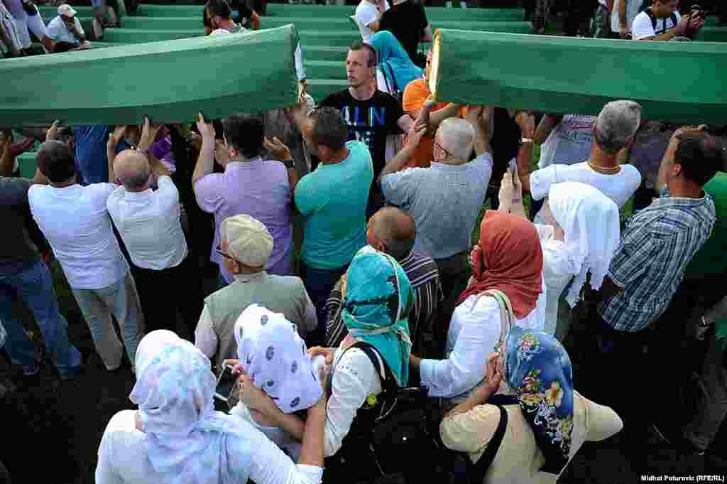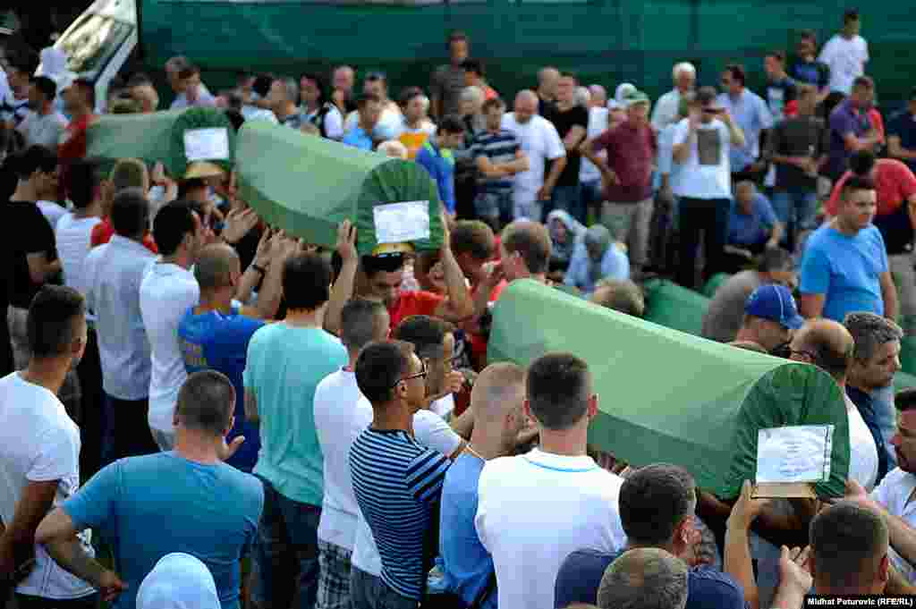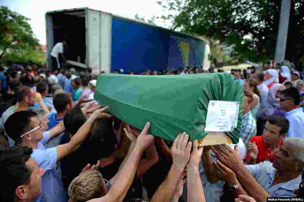 Kolona s posmrtnim ostacima 284 žrtve koje su ubijene tokom proteklog rata na području Prijedora, stigla je u subotu u poslijepodnevnim satima u Kozarac, gdje će u nedjelju biti obavljena kolektivna dženaza i ukop. Konvoj su na stadionu u Kozarcu dočekali uplakani članovi porodica koji su pomogli u iznošenju tabuta iz kamiona i polaganju na travnjak. Kamioni s tabutima iza podne su iz Identifikacionog centra Šejkovača krenuli prema ovom gradu, a tužna kolona je na putu do Kozarca prošla kroz Sanski Most i Prijedor. RSE/Foto: Midhat Poturović