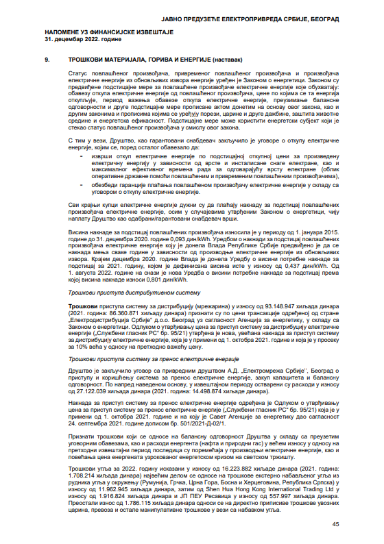 Međutim, da Elektroprivreda Srbije uvozi ugalj iz Republike Srpske, vidi se u finansijskom izvještaju za 2022. godinu, koji je dostupan na sajtu Agencije za privredne registre.