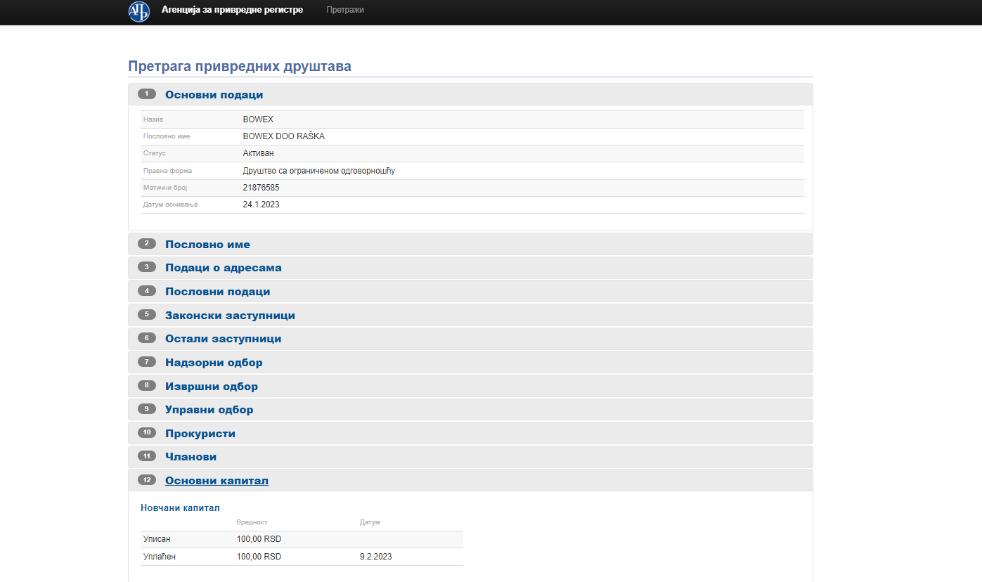 Firma "Bowex“, prema podacima Agencije za privredne registre, osnovana je početkom ove godine – sa početnim kapitalom od samo 100 dinara, što je manje od jednog evra.