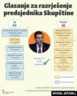 Za smjenu je glasalo 43 poslanika opozicionih partija predvođenih Demokratskom partijom socijalista (DPS) i poslanicima Građanskog pokreta URA, dok je protiv bilo 36 poslanika Demokratskog fronta (DF) i Demokrata.