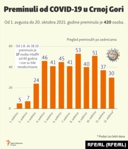 U oktobru je najviše preminulih u jednom danu zabilježeno u nedjelju, 17. oktobra, kada je bitku sa COVID-om izgubilo 13 građana, dok je rekord po smrtnosti zabilježen 8. marta, kada je preminulo 18 građana pozitivnih na korona virus.