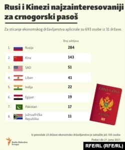 Za crnogorski pasoš posredstvom investicija bilo je zainteresovano blizu 700 osoba i to najviše iz Rusije, Kine, SAD-a i Libana, podaci su Vlade Crne Gore iz juna 2021. godine.