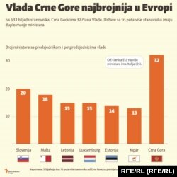 Crna Gora koja ima nešto preko 620.000 stanovnika, sa 32 člana Vlade i čak 54 državna sekretara ima najbrojniju Vladu u Evropi.
