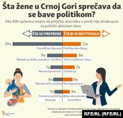 Iako ih je u populaciji oko 50 posto, u Skupštini Crne Gore od ukupno 81 poslanika, tek su 22 žene od kojih je jedna potpredsjednica parlamenta. Nijednu političku partiju u Crnoj Gori ne predvodi žena.