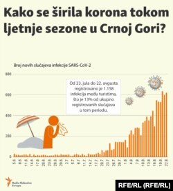 U cilju sprečavanja širenja zaraze u Crnoj Gori je aktuelnim epidemiološkim mjerama od 20. avgusta dozvoljeno maksimalno prisustvo do 50 ljudi na otvorenom prostoru, dok slike gužvi sa crnogorskih plaža svjedoče o nepoštovanju mjera.