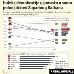 U izvještaju "Države u tranziciji" (Nations in Transit), koji obuhvata 29 zemalja, navodi se da je region Zapadnog Balkana odgovoran za mnoge zabrinjavajuće događaje, kao i da je regionalna bezbjednost mnogim političkim čelnicima izgovor za potkopavanje demokratskih institucija i zanemarivanje demokratskih normi.